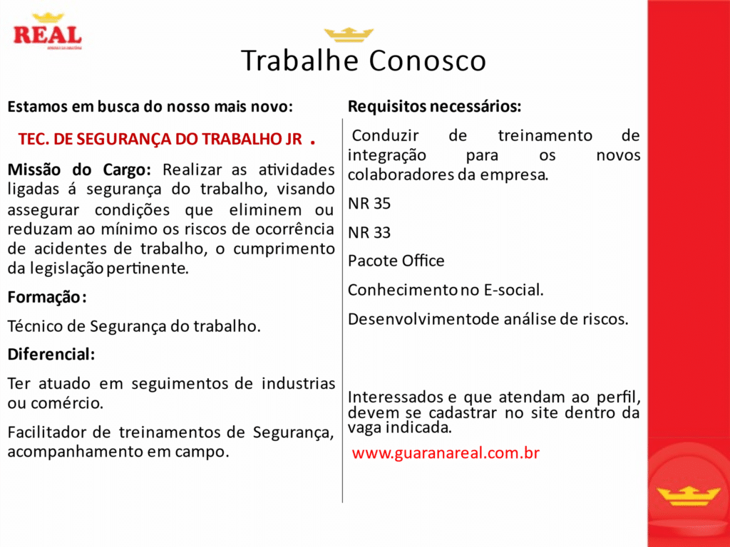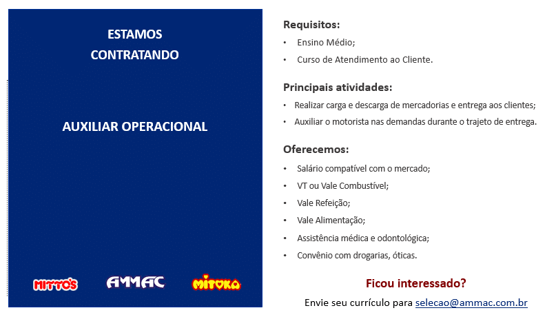 As vagas anunciadas e disponibilizadas neste site são repassadas por responsabilidade da empresa ou representante do RH. Não possuímos quaisquer vínculos com a empresa ou o anunciante. Temos o único objetivo de repassar para a população o benefício de visitar gratuitamente o nosso site, com o intuito de alcançarem o tão sonhado emprego.