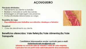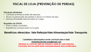 As vagas anunciadas e disponibilizadas neste site são repassadas por responsabilidade da empresa ou representante do RH. Não possuímos quaisquer vínculos com a empresa ou o anunciante. Temos o único objetivo de repassar para a população o benefício de visitar gratuitamente o nosso site, com o intuito de alcançarem o tão sonhado emprego.