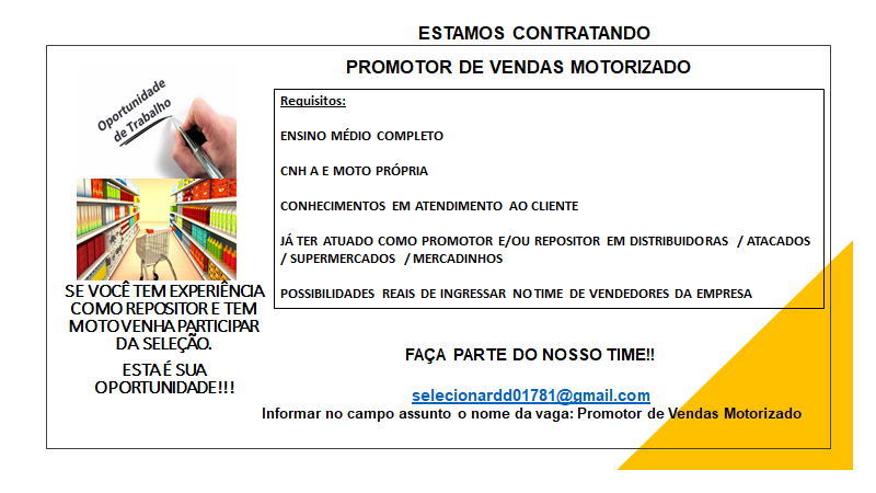 As vagas anunciadas e disponibilizadas neste site são repassadas por responsabilidade da empresa ou representante do RH. Não possuímos quaisquer vínculos com a empresa ou o anunciante. Temos o único objetivo de repassar para a população o benefício de visitar gratuitamente o nosso site, com o intuito de alcançarem o tão sonhado emprego.