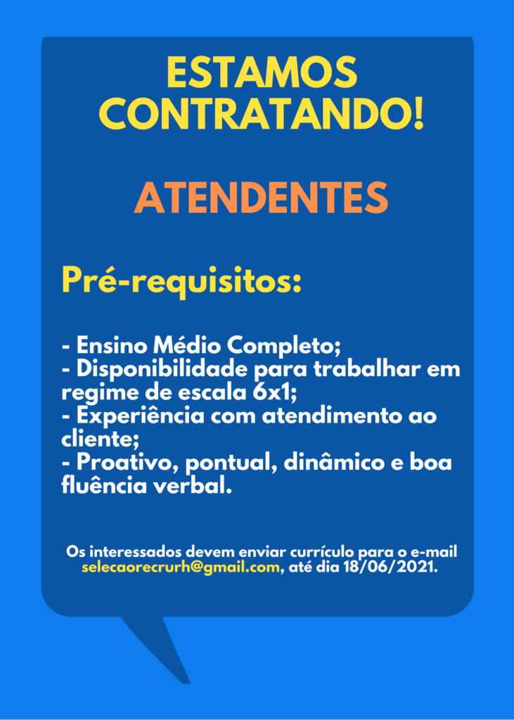 ATENÇÃO: Nunca pague nenhum valor para participar de um processo seletivo. Não compre cursos, apostilas ou serviços que prometam participação em seleção ou contratação para uma vaga. E jamais informe dados bancários, de cartão ou envie documentos por e-mail ou através de sites que não conheça.