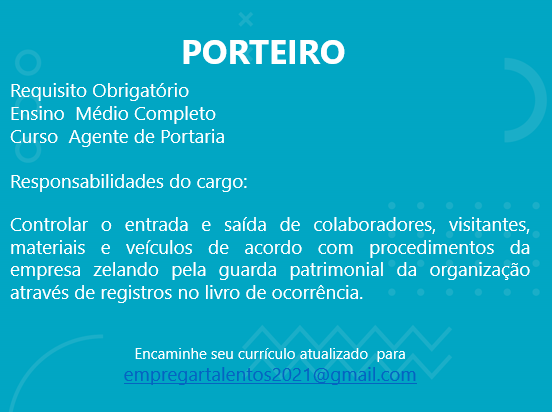 As vagas anunciadas e disponibilizadas neste site são repassadas por responsabilidade da empresa ou representante do RH. Não possuímos quaisquer vínculos com a empresa ou o anunciante. Temos o único objetivo de repassar para a população o benefício de visitar gratuitamente o nosso site, com o intuito de alcançarem o tão sonhado emprego.
