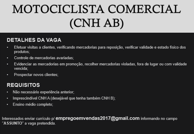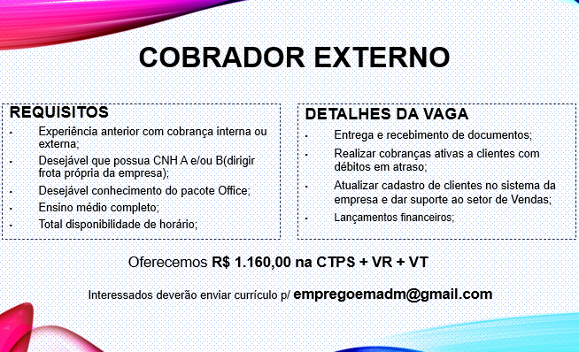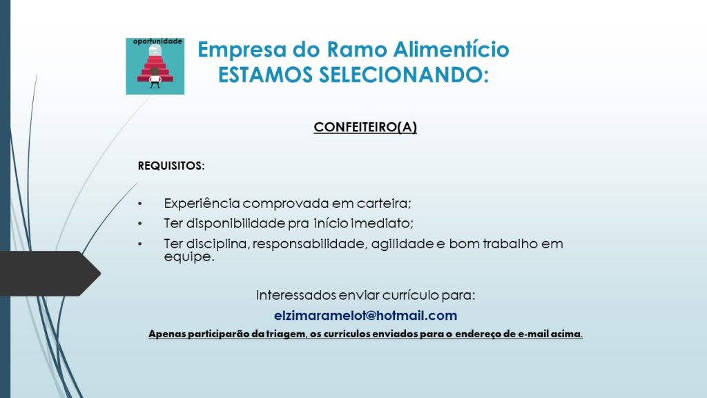 As vagas anunciadas e disponibilizadas neste site são repassadas por responsabilidade da empresa ou representante do RH. Não possuímos quaisquer vínculos com a empresa ou o anunciante. Temos o único objetivo de repassar para a população o benefício de visitar gratuitamente o nosso site, com o intuito de alcançarem o tão sonhado emprego.